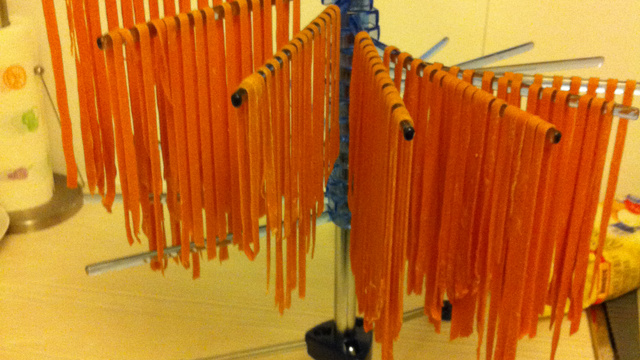 Passer la pâte dans une machine à pâtes (N°2 pour moi) et faire cuire les pâtes 5 minutes dans un grand volume d'eau bouillante