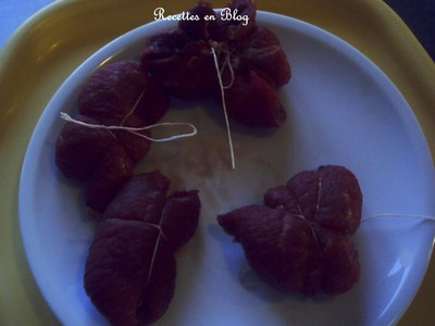 Mettre l'équivalent d'une petite cuillère à soupe de farce sur chaque tranche de boeuf et la rouler sur elle même pour la ficeler.