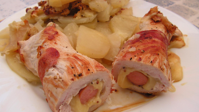 Tartiner les escalopes de dinde de moutarde. Poser dessus une tranche de fromage à raclette, puis une saucisse. Rouler le tout en paupiette, entourer chaque paupiette d'une tranche de lard fumé et maintenir avec de la ficelle de cuisine (j'ai utilisé des cure-dent en bois).