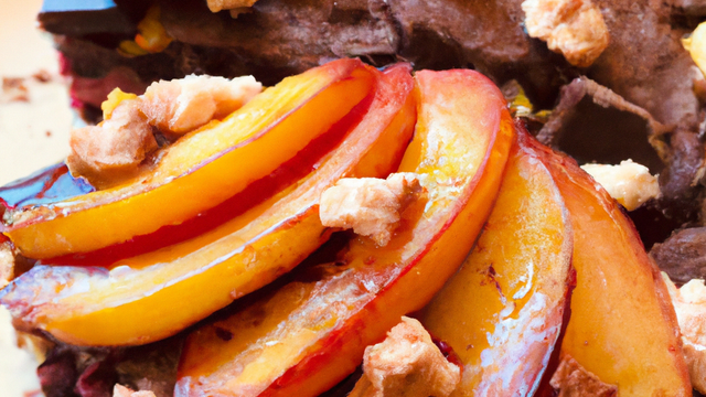 Pavé en trois parties: une au chocolat suivie d'une avec les pêches et une autre au chocolat