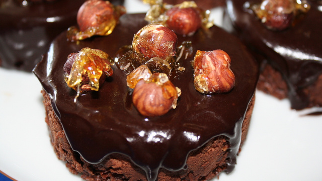 Vous pouvez comme moi faire votre pralin (faire un caramel et le verser sur des amandes et/ou noisettes hachées et torréfiées; mixer après refroidissement). Pour le décor, verser du caramel sur les noisettes éloignées les unes des autres, sur un papier ou les mélanger dans le caramel et les sortir une à une. Pour le nappage, poser chaque entremet sur une grille et utiliser un pichet pour verser le nappage; s'il en reste on peut rajouter un décor dans l'assiette et jouer avec la crème anglaise.