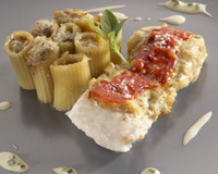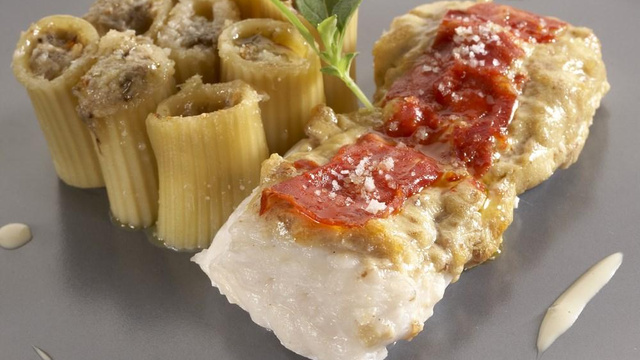 Accompagner le poisson d'une timballe de macaronis farcies avec aubergines et ricotta.