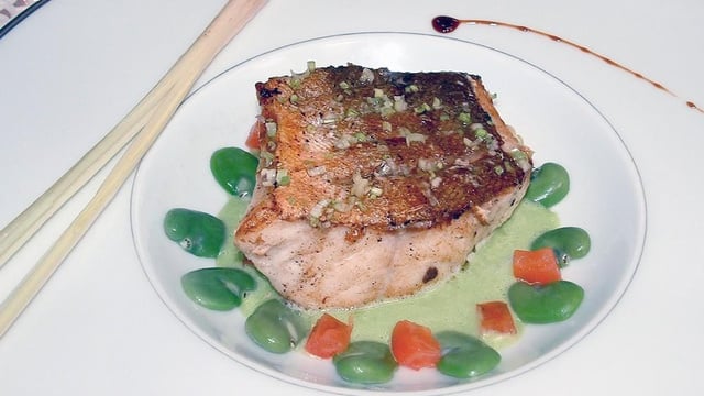 Dresser le filet sur la pulpe de petits pois, accompagné des fèves et de la sauce crémée.