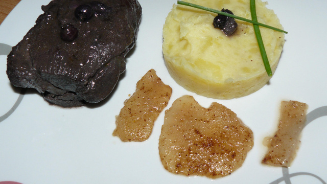Dresser à l'aide d'un cercle de présentation l'écrasé de pommes de terre surmonté de quelques myrtilles et d'un brin de ciboulette. Déposer quelques lamelles de poires aux épices refroidies et dresser enfin le pavé de sanglier entier nappé de sa sauce.