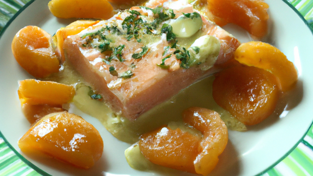 6. Répartissez les pavés de saumon dans quatre assiettes avec trois abricots, arrosez de beurre fondu au citron. Décorez de brins de ciboule et parsemez de graines d'anis. Servez chaud.