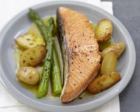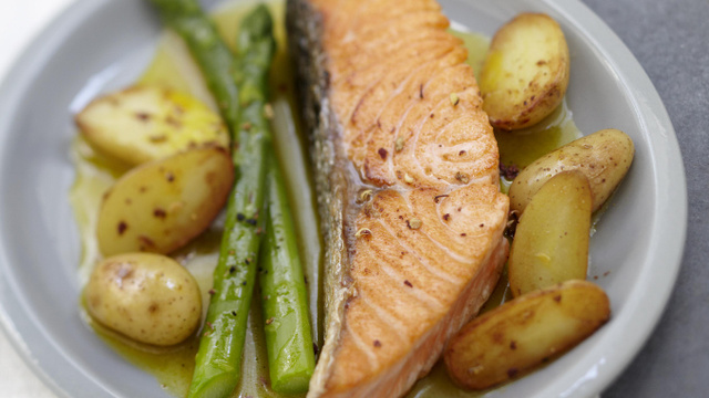 Coupez les pommes de terre en deux, faites-les dorer 2 à 3 mn dans une poêle dans 2 cuillerées à soupe d'huile d'olive, gardez-les au chaud. Faites cuire les pavés de saumon 3 à 4 mn de chaque côté dans une poêle dans le reste de l'huile d'olive.