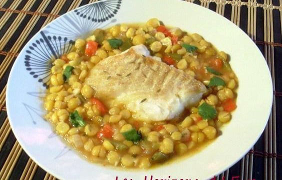 Verser les pois chiches de préférence dans une assiette creuse et déposer le pavé de cabillaud. Agrémenter de coriandre fraîche et de graines de cumin.