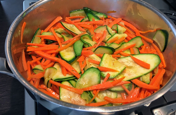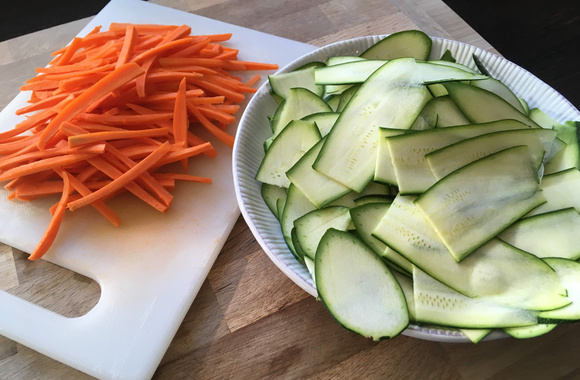 Lavez et taillez les courgettes en lamelles à l'aide d'une mandoline afin de réalisez des tagliatelles de courgettes. Épluchez, lavez les carottes et réalisez une julienne de carottes. Pour cela, commencez par découper les extrémités du légume. Taillez ensuite en fines tranches d’environ 1mm d’épaisseur, soit à l’aide d’un couteau, soit à l’aide d’une mandoline. Découpez ensuite les bâtonnets de la même épaisseur.