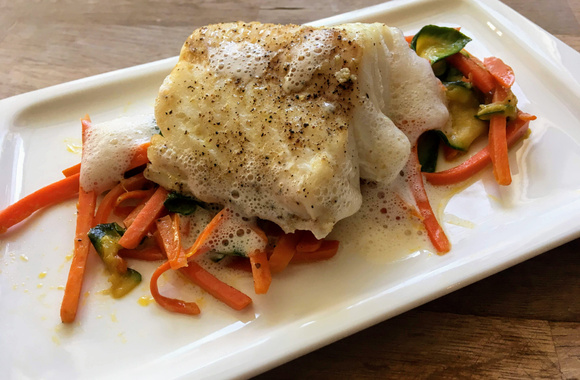 Les amateurs de poissons vont adorer ce pavé de cabillaud cuit tout simplement au four et accompagné de légumes et arrosé d'une sauce à base de fumet de poisson aromatisé au gingembre confit sucré. Une recette inspirée de celle du chef François Pasteau.