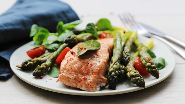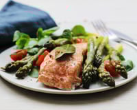 Mettez de l'eau dans le plat Crousty puis posez la plaque à vapeur par-dessus. Sur la plaque à vapeur, déposez une douzaine d'asperges vertes puis les 2 pavés de saumon avec une feuille de laurier. Salez et poivrez. Couvrez avec la cloche en inox Steamchef et déposez le plat dans le four micro-ondes combiné.