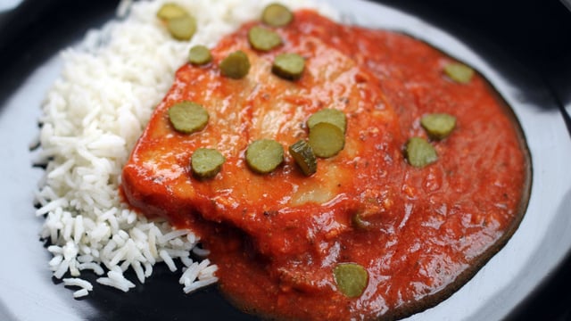 Déposer 4 pavés de thon sur les gousses d'ail et ajouter le coulis de tomates, 2 cuillères à soupe de ketchup Amora, les cornichons coupés en petites rondelles, la feuille de laurier et les herbes de Provence. Ajouter le piment de Cayenne.