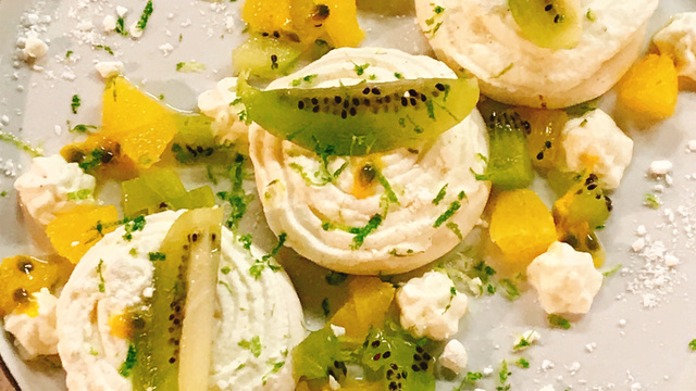 Juste avant de servir, répartissez les fruits sur la crème, coupez les fruits de la passion en deux et ajoutez le jus et la chair sur chaque Pavlova.