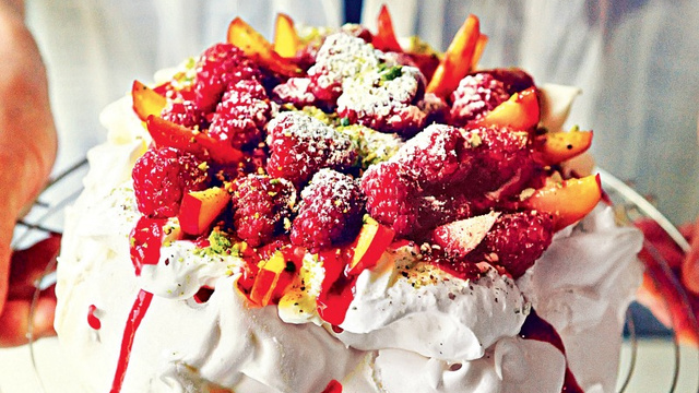 Arrosez avec le coulis de framboises et parsemez de pistaches hachées. Terminez en saupoudrant la pavlova d'un peu de sucre glace. Dégustez sans tarder car l'attente ferait perdre à ce dessert de son craquant et de son onctuosité.