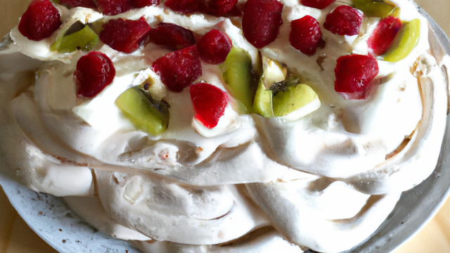 Au moment de servir, montez la crème chantilly et étalez la sur la meringue, avant de décorez abondamment le gâteau de tranches de fruits de votre choix.