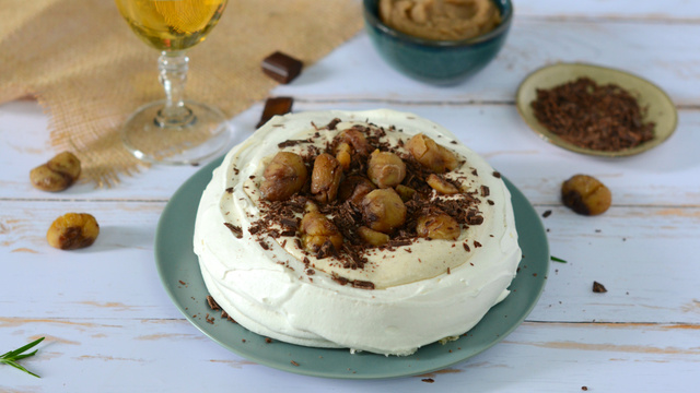 Garnissez le centre de la pavlova de crème chantilly aux marrons.