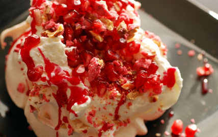 Pour le montage mettez de la crème sur les meringues, puis en alternance des grains de grenade, éventuellement un peu de crème fouettée, et finissez par le sirop de rose.