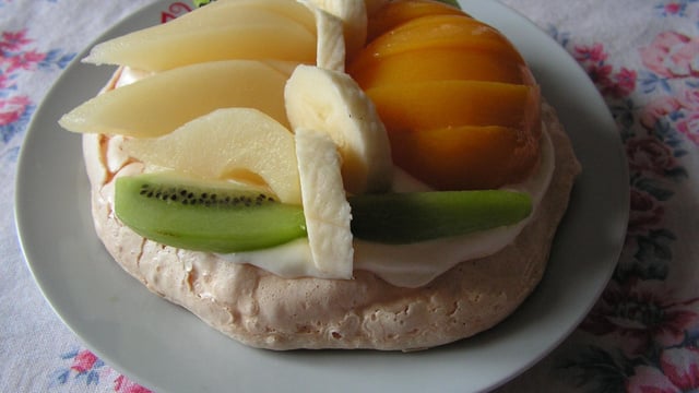 Etaler cette crème sur la meringue et répartir les fruits à la surface.