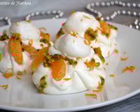 Sur chaque nid de meringue, ajoutez de la chantilly, quelques quartiers de clémentines au sirop et les graines de fruits de la passion.Ajoutez encore un peu de chantilly et terminez avec les petits chapeaux de meringue.