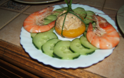 Couper le concombre et le disposer autour de la pêche.