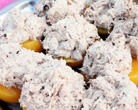 Mettre une bonne cuillère à soupe de cette mayonnaise au thon sur des moitiés de pêches au sirop au préalablement égouttées.