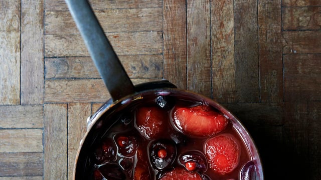 Tremper les pêches dans de l'eau bouillante, les peler et les couper en 2. Oter le noyau. Dans une casserole, verser les ingrédients, porter à ébullition.
