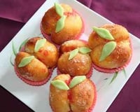 Au tamis, saupoudrer les pêches de sucre et déposez les dans des caissettes en papier. Découper des feuilles dans la pâte d'amandes colorée et placer les au sommet de chaque pêche. - 3