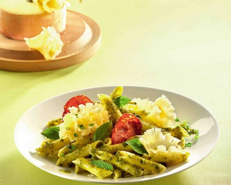 Mélanger dans une casserole, les penne avec le pistou, en variant la quantité selon les goûts. Ajouter un filet d'huile d'olive. Griller 5 secondes les tranches de chorizo, dans une poêle très chaude. Réaliser les Rosettes de Tête de Moine AOC avec une Girolle. - 3