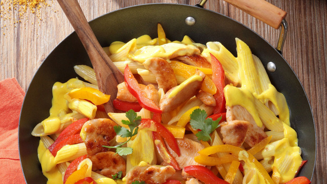 Égouttez les pâtes, mélangez-les dans la sauce et ajoutez-y le poulet.