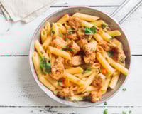On apprécie toujours un bon plat de pâtes le soir en rentrant du boulot mais aussi le week-end quand on a pas envie de passer des heures en cuisine. Cette version au poulet est un plat complet que l'on aime aussi glisser dans notre lunchbox.