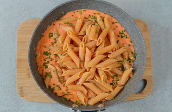 7Ajoutez les penne égouttées, 20 cl d'eau de cuisson des penne et la ciboulette. Mélangez.