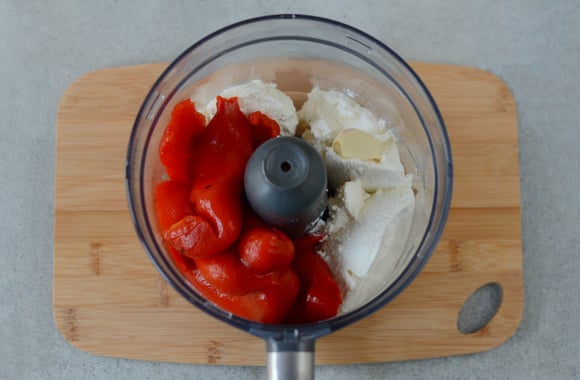 3Dans un bol à mixer, mettez les poivrons grillés, la ricotta et la gousse d'ail. Mixez.
