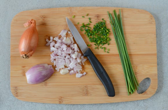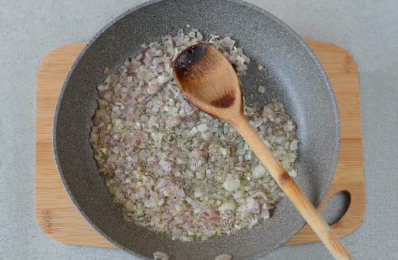 5Dans une poêle avec 3 cuillères à soupe d'huile d'olive, faites revenir l'échalote 2 minutes. Salez et poivrez.