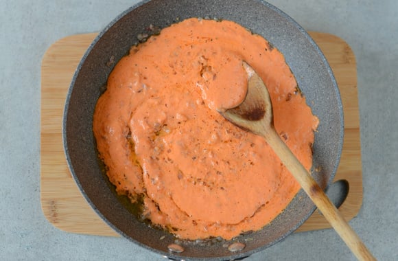 6Ajoutez la crème de poivrons. Mélangez et laissez mijoter 1 minute.
