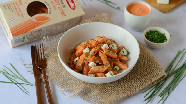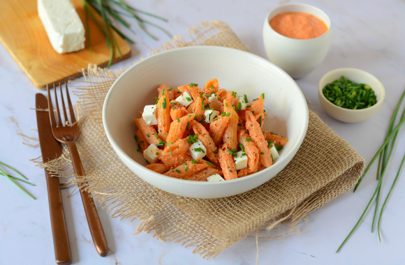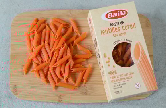 Une recette originale avec ces Penne de lentilles corail préparées avec une crème à base de poivrons rouges qui va donner à l'ensemble un aspect gourmand.