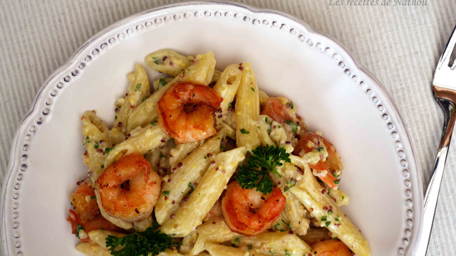 J'adore les pâtes, les crevettes, la moutarde, le parmesan... et si on assemblait tout ça ? Et il me reste un peu de quinoa... pourquoi pas ? Allons-y gaiement :-)