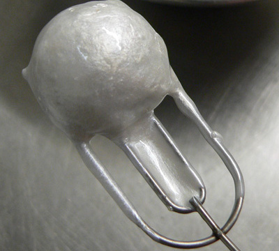 Refroidir en mélangeant pour éviter les grumeaux.La finition:Mélanger l'eau chaude, le colorant et la gélatine trempée et égouttée.Démouler les demi-sphères, les paner à la chapelure de pain d'épices, passer au chaud froid en deux fois, puis au « glaçage » argent.