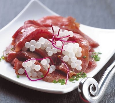 - - Disposer les tranches de boeuf dans de jolies assiettes.- Badigeonner d'un peu de vinaigrette.- Assaisonner avec un peu de fleur de sel et de poivre du moulin.- Disposer les perles des sous bois sur le carpaccio.- Décorer avec quelques pousses de betteraves.
