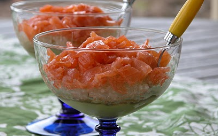 Une petite verrine qui vaut son détour ! Très belle d'apparence et goûteuse à souhait, elle change des éternels avocats mayonnaise et saumon toasté. De plus, vous ferez découvrir ces petites perles qui roulent sur la langue (d'ailleurs si vous n'en trouvez pas remplacez-les par du tapioca) effet garanti !