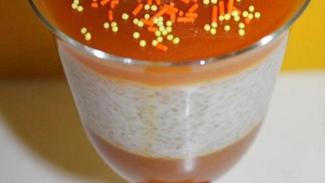 Ajouter les perles du Japon et cuire environ 15 mn à feu doux. Laisser un peu refroidir et verser sur la gelée d'oranges. Placer au réfrigérateur. Déguster bien frais ....