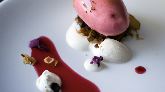 Petit entremets composé d'un biscuit cuiller punché à la crème de cassis, d'une mousse au cassis et d'un palet gélifié au cassis, accompagné d'une glace aux pains d'épices et d'un coulis de vin rouge.