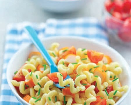 pour parfumer les pâtes. Pour une salade de pâtes, remplacer le beurre par une vinaigrette au citron. Servir le plat froid. Pour amuser les enfants, combiner les tomates cerises, 'rouge, orange et jaune.