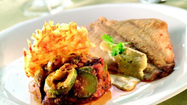 Chauffer doucement. Chauffer les courgettes dans une casserole à feu doux. Servir un filet de carrelet avec la sauce à la moutarde, 1 ou 2 gaufres de pomme de terre et les courgettes à la Provençale bien chaudes.