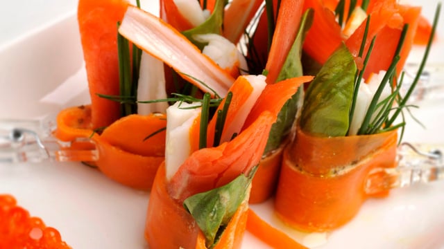 Tartiner sur chaque bande 2g de moutarde aux herbes. Placer dessus une pousse d'épinard, une tranche de 40g de saumon sauvage fumé, un bâtonnet de surimi, 2 feuilles de coriandre, des tiges de ciboulette de 6 cm.