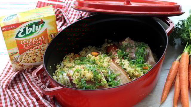 Quand la viande est pochée, ajoutez-la aux Céréales & Lentilles précuites ainsi que les saucisses de Montbéliard piquées à la fourchette. Laissez mijoter le tout à feu doux 30 à 45 minutes