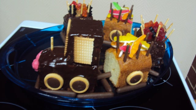 Pour l'assemblage du train : couper les cakes en 4 morceaux de manière à obtenir une locomotive et 2 wagons de taille identique et un petit morceau qu'il faut poser sur la locomotive de façon à avoir une cabine (voir photo pour plus de clarté ;-)).