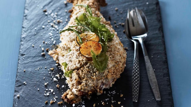 Retirez du four, cassez la croûte de sel doucement avec un couteau. Utilisez un pinceau à pâtisserie pour retirer les cristaux de sel. Sortez le poisson avec une pelle à tarte, retirez les algues, la peau et les nageoires. Servez tout simplement avec des morceaux de citron et une pincée de poivre.