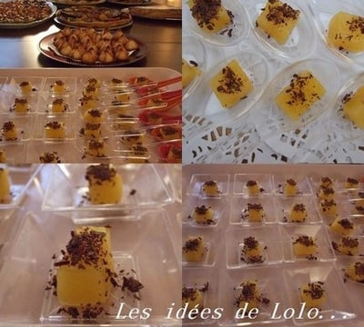 - Pressez les oranges, ajoutez le sucre et le gingembre au jus et faites chauffer la moitié de ce jus dans une casserole.Pendant ce temps, faites tremper les feuilles de gélatine dans de l'eau froide. Dès qu'elles sont ramollies, essorez-les bien et mélangez-les à l'aide d'un fouet, au jus d'oranges chauffé puis ajoutez le reste de jus et mélangez.Prenez un moule carré de préférence, et couvrez-le d'une feuille de papier sulfurisé.Versez le jus de fruits et laissez prendre au réfrigérateur quelques heures.Une fois la gelée prise, posez la feuille de papier sulfurisé et la gelée sur votre plan de travail et découpez des petits dés.Présentez dans des cuillères de présentation ou des petites coupelles...Râpez un bon chocolat noir à l'aide d'un économe, et parsemez-en les dés de gelée.