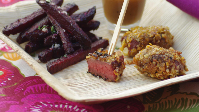 Pour revisiter les célèbres bouchées de poulet et leurs frites, voici une petite assiette à déguster avec les doigts en apéritif raffiné ou en entrée légère. Le fondant du pigeon contraste avec le croquant des noisettes et des corn flakes, les betteraves apportent leur douceur, le tout étant sublimé par le bouillon subtilement relevé.