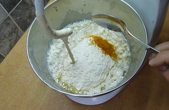 2Après ce laps de temps, fixer la cuve sur le socle du batteur puis ajouter la levure. Ensuite l'eau, la farine, le curcuma et les graines de sésame. Malaxer à petite vitesse votre préparation pendant environ 12 minutes.