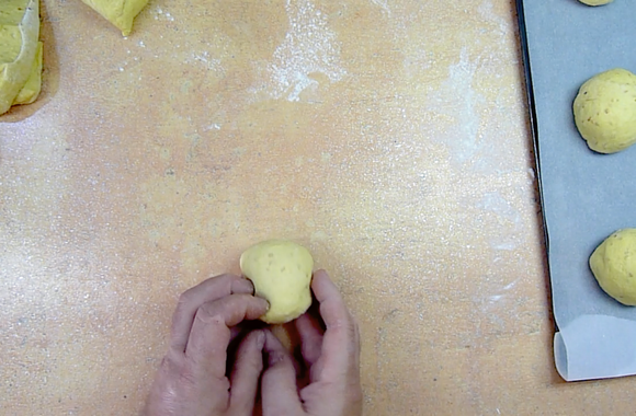4Façonner après cette pousse vos boules, dont le poids doit être environ de 100 g. Les disposer sur votre plaque de cuisson et laisser pousser 1 h 30 dans une pièce à 20°C.